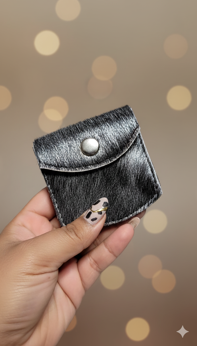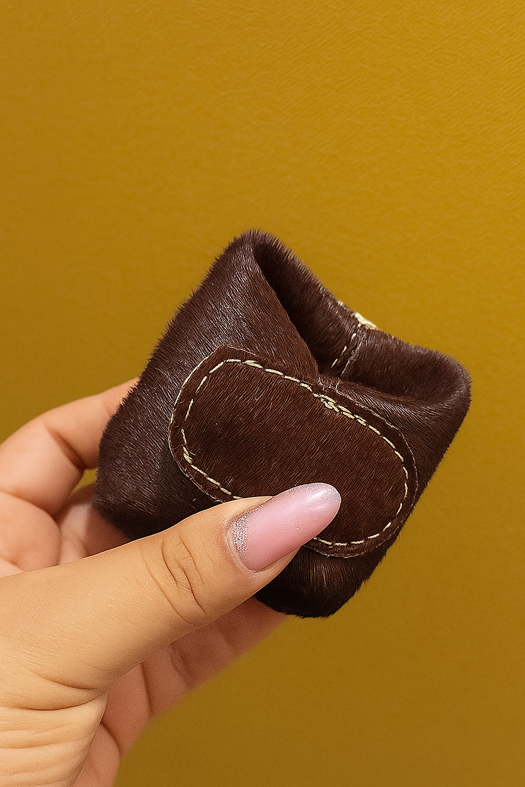 Monedero artesanal elaborado con mermas de cuero con pelo, reutilizando retazos que normalmente serían desechados en la industria del calzado y la marroquinería. Su diseño pequeño, práctico y resistente lo convierte en un accesorio ideal para llevar monedas u objetos pequeños, al mismo tiempo que promueve el consumo responsable y la sostenibilidad. Cada pieza es única gracias a las variaciones naturales de las mermas utilizadas.