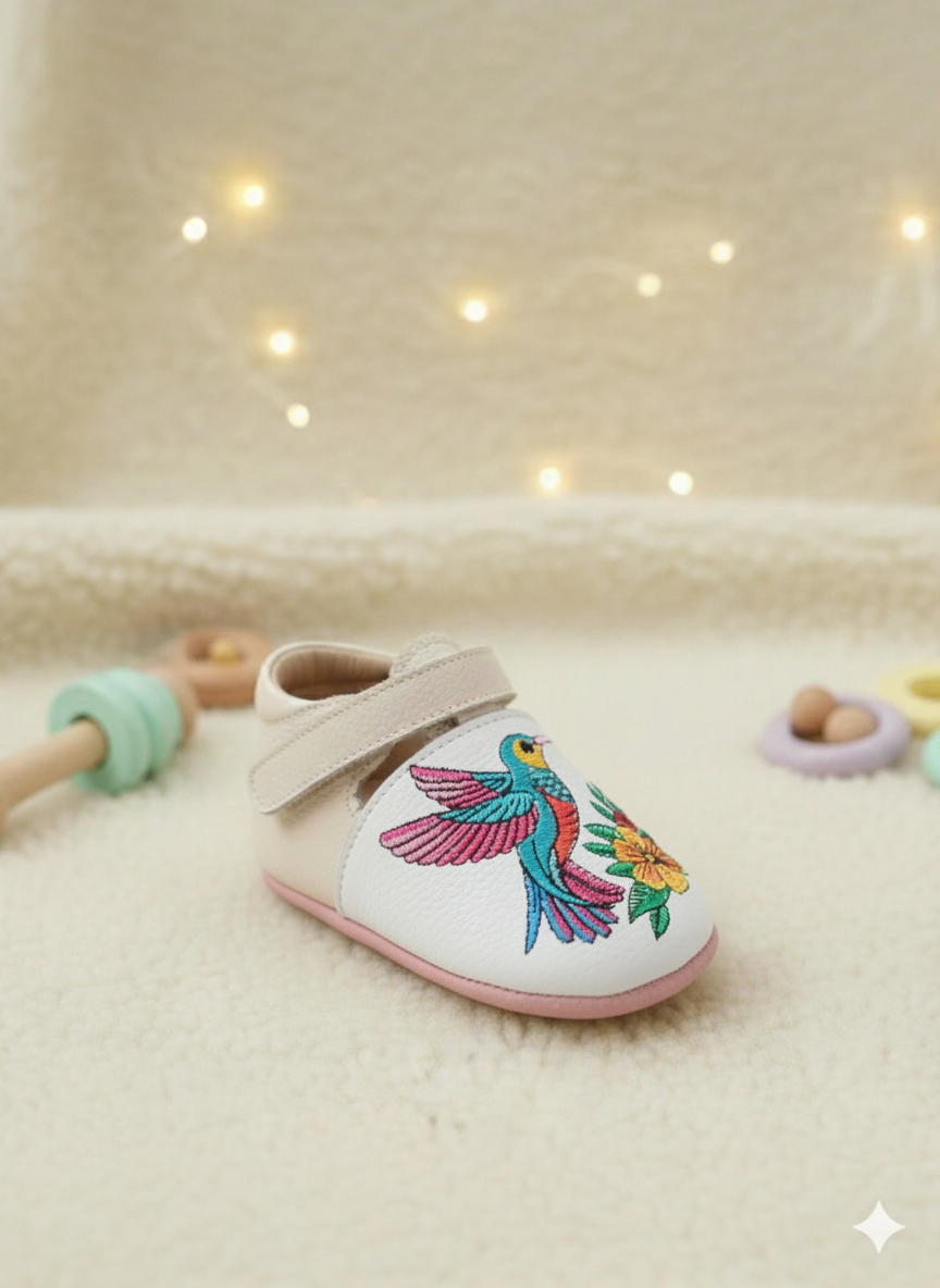 El vibrante diseño bordado con un colibrí y flores silvestres añade un toque de alegría y color a cada aventura. El forro de badana y la plantilla del mismo material aseguran una transpiración óptima y un confort inigualable, permitiendo que sus pies respiren y se mantengan frescos durante todo el día.