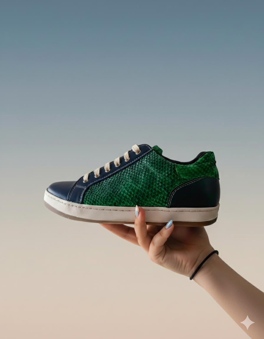 El calzado Serpentín Mahi es una pieza artesanal que fusiona la sofisticación urbana con la belleza del océano. Cada par es único, elaborado con un exclusivo cuero de mahi-mahi que presenta una textura de escamas finas. Este material se complementa con cuero vacuno de alta calidad, garantizando estilo, comodidad y durabilidad. Un diseño atemporal que te permite llevar la esencia de las profundidades marinas en cada paso.